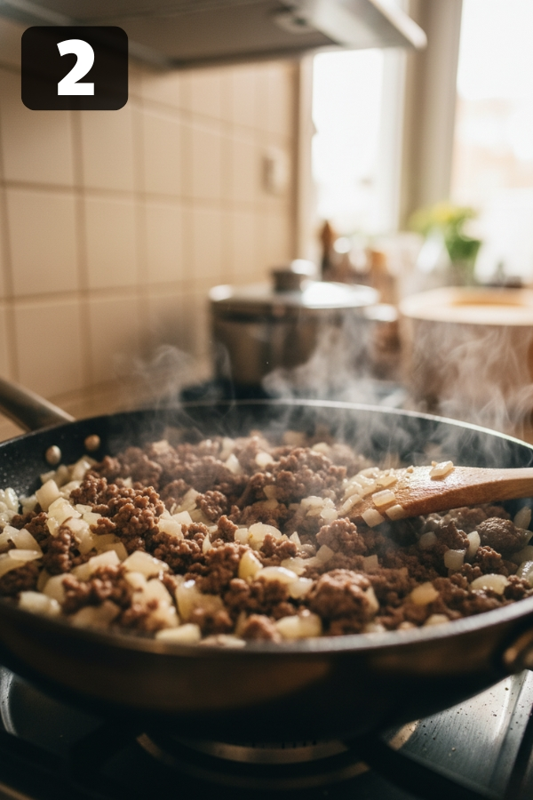 - Step 2: Brown the Beef: Warm a large skillet over medium heat. Sauté the diced onion for 2–3 minutes until it softens, then stir in the minced garlic. Add the ground beef and break it apart with a spoon. Cook for about 6–8 minutes, or until no pink remains. If the beef releases more fat than you prefer, drain off the excess — you want flavor, not grease.