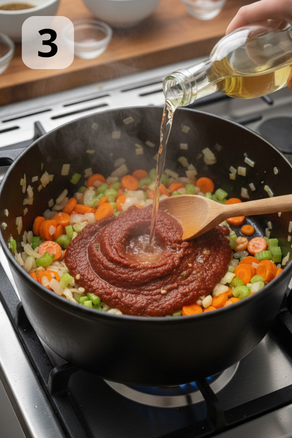 - (Optional) Deglaze With White Wine — ~5 minutes Pour in: Add about 1/3 cup white wine. Scrape: Use a wooden spoon to scrape up the browned bits stuck to the bottom (that’s concentrated flavor). Cook down: Simmer until the wine is mostly evaporated and the pot doesn’t smell strongly of alcohol—usually 3–5 minutes. If skipping wine: You can deglaze with a splash of broth instead and still scrape up those browned bits.