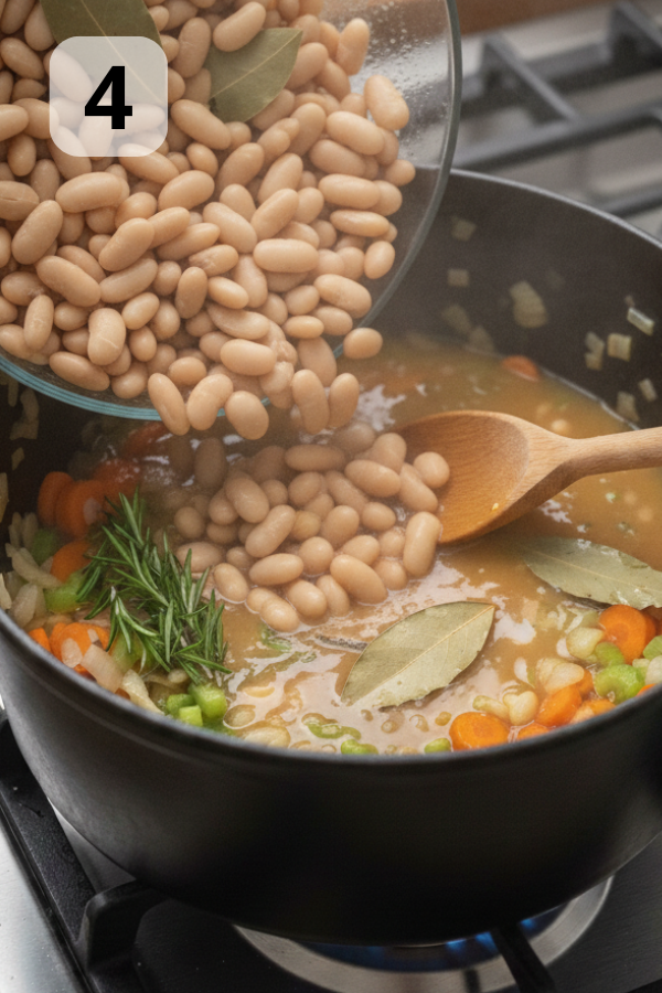 - Simmer — 15 minutes Add the main ingredients: White beans (drained) Broth (start with 4 cups, add more later as needed) Bay leaves Optional flavor boosters (add now): Rosemary sprigs Parmesan rind (adds savory depth; remove before serving) Bring to a boil, then reduce: Bring the soup up to a gentle boil, then lower to a steady simmer (small bubbles, not a rolling boil). Why simmer matters: This is where the vegetables finish softening and the beans absorb flavor. Consistency check at the end of 15 minutes: If it’s already thick enough, keep broth as-is. If it’s too thick, add broth 1/2 cup at a time.
