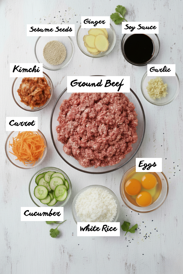 - Build Your Bowls Now for the fun part. Add rice or cauliflower rice to each bowl. Spoon a generous layer of beef on top. One pound of beef usually makes 4 good servings; if you want extra protein, lean toward bigger beef scoops. Arrange cucumbers, carrots, greens, and kimchi around the edges. Add your protein boosters: egg, edamame, cottage cheese, or tofu. Sprinkle with scallions and sesame seeds. Finish with a drizzle of gochujang or chili crisp for anyone who likes heat. Serve right away while the beef is hot and the veggies are still crisp.