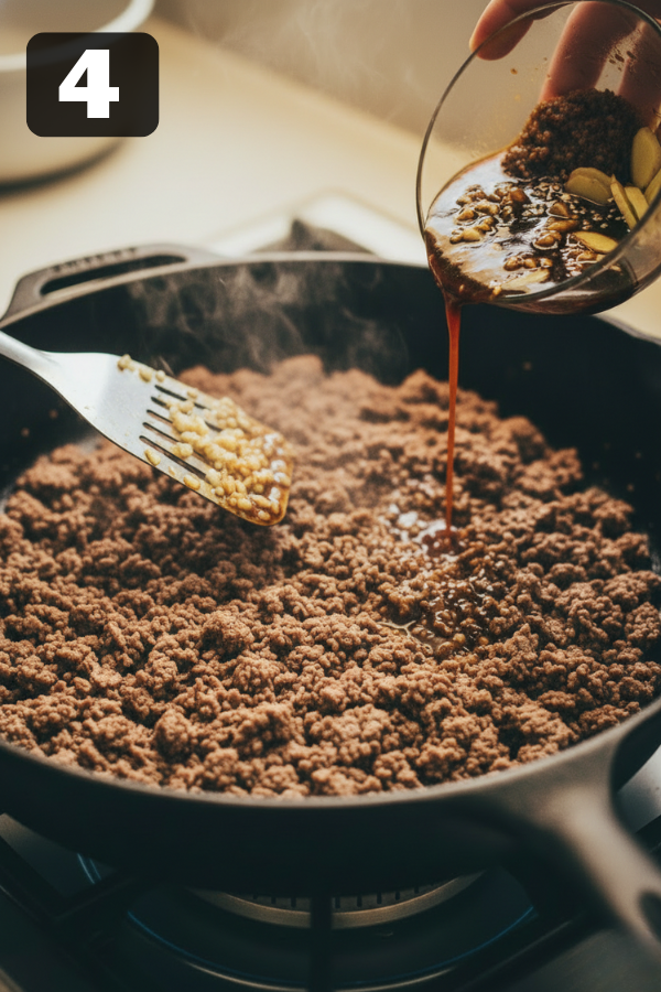 - Add Aromatics And Sauce Now you’re building that classic Korean bowl smell that makes everyone wander into the kitchen. Push the beef to one side. Add a little more oil if the pan is dry, then cook the garlic and ginger for about 30–60 seconds until fragrant. Pour in the sauce and stir to coat the meat. Let it simmer for 5–10 minutes until the liquid thickens and clings to the beef. You should see a glossy, slightly sticky sauce hugging every crumble.