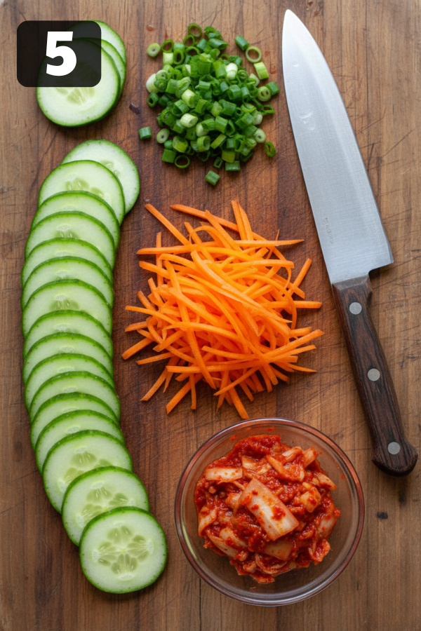 - Prep Your Toppings While It Simmers While the beef quietly bubbles: Slice cucumbers and carrots. Rinse and dry your greens. Chop scallions. Fry or soft-boil eggs if you’re using them. This is also your “clean as you go” window—future you will be very grateful.