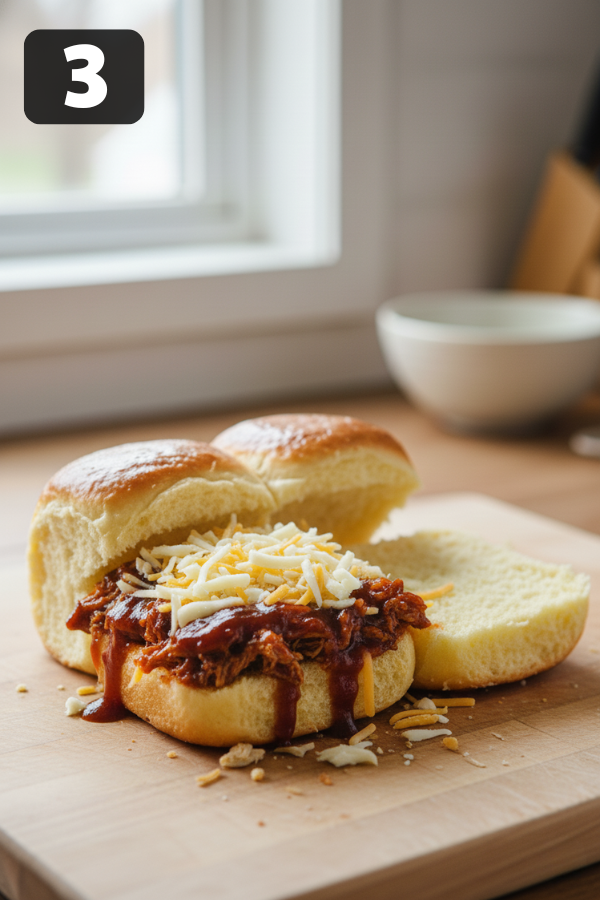 3. Layer the Filling Spread the BBQ chicken evenly over the rolls. Next comes the cheese. Sprinkle it across the chicken so it melts into every bite. If you’re adding extras—pickles, onions, or jalapeños—layer them here. Then place the top half of the rolls back over everything. It should look like one giant sandwich. And honestly, it already smells good.