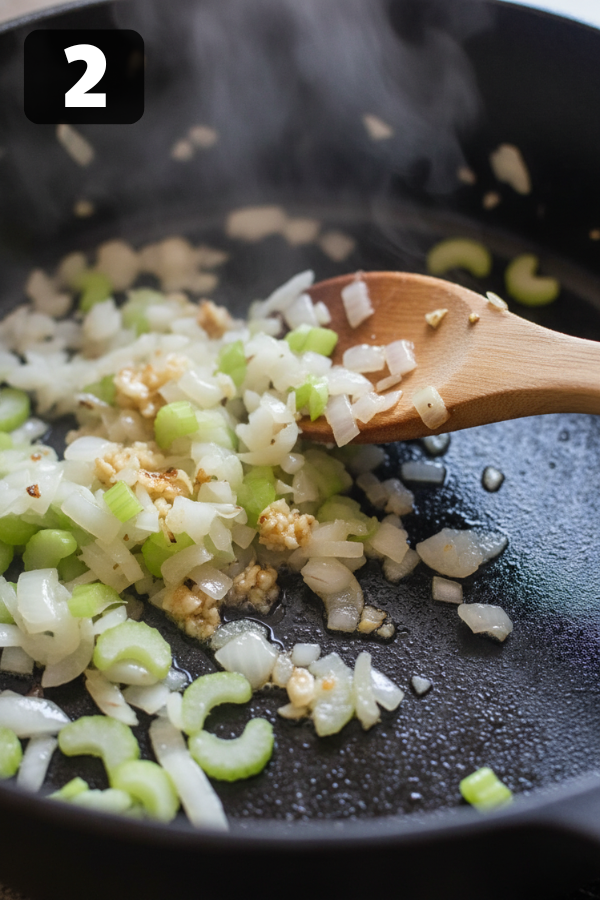 - Step 2 – Build The Flavor BaseAdd onion, garlic, and celery directly into the same pot.Cook for 3–5 minutes until soft and fragrant.If the pot looks a little messy—that’s good. Those browned bits are flavor gold.