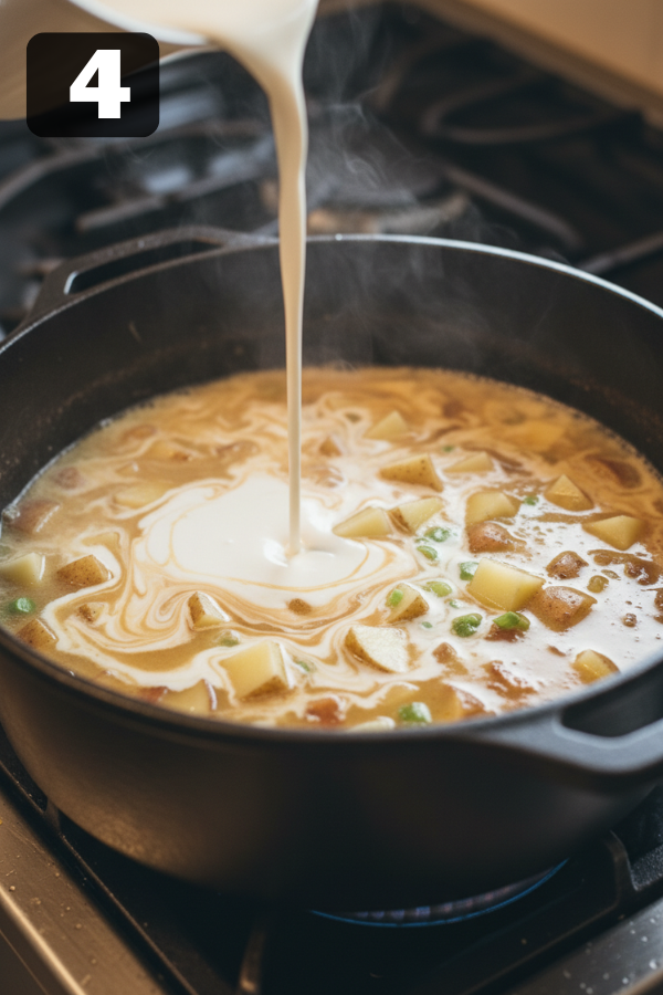 - Step 4 – Make It CreamyHere’s where things get flexible.Mash some of the potatoes for a thicker soupOr leave it chunky for more textureThen stir in the milk or cream.Keep the heat low here—too hot and dairy can split.