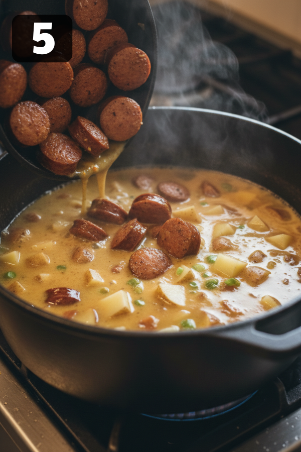 - Step 5 – Bring It All TogetherReturn the sausage to the pot.Add Cajun seasoning, stir well, and let everything simmer for another 5–10 minutes.Taste it.Then adjust:More salt?More spice?Maybe a splash of broth?This is your moment to make it yours.