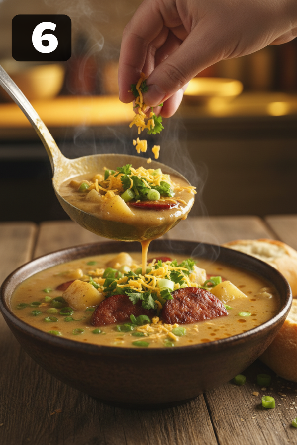 - Step 6 – Finish And ServeLadle into bowls and top with:Green onionsCheeseFresh herbsOr honestly—nothing at all. It’s good either way.