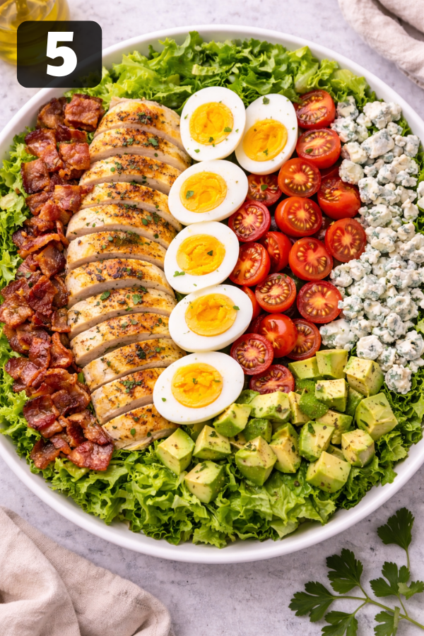 - Step 5: Assemble the SaladSpread lettuce in a large bowl or platter.Then layer everything in rows:ChickenBaconEggsAvocadoTomatoesBlue cheeseIt looks nice, sure—but it also keeps textures separate until serving.