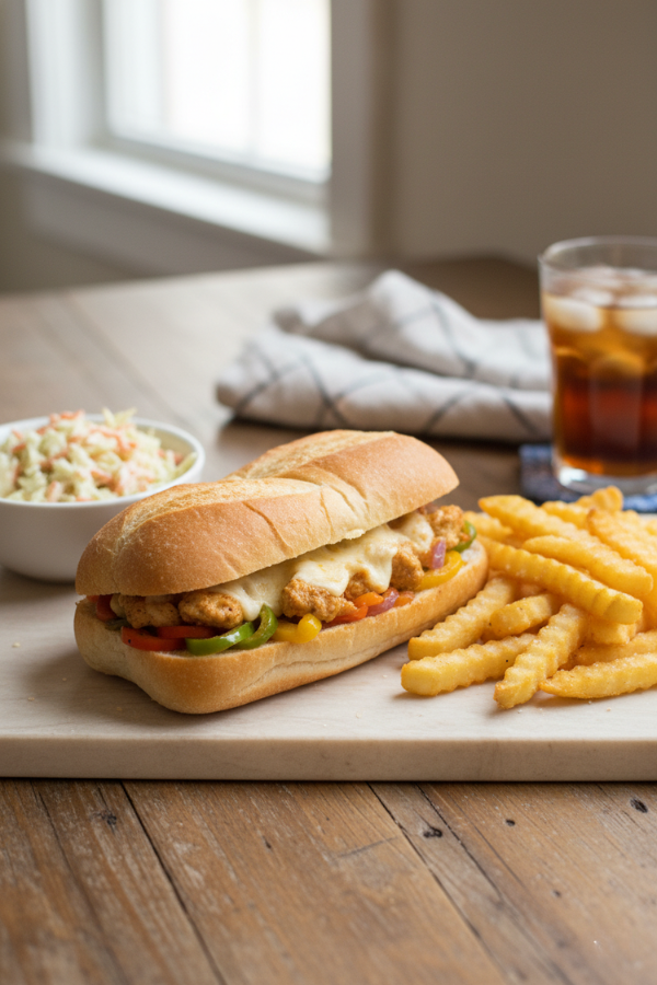 A Chicken Philly Cheesesteak is basically a lighter twist on the classic sandwich from Philadelphia. Instead of thinly sliced beef, you use chicken—usually breast or thigh—cooked with onions, peppers, and melted cheese, all tucked into a soft hoagie roll.