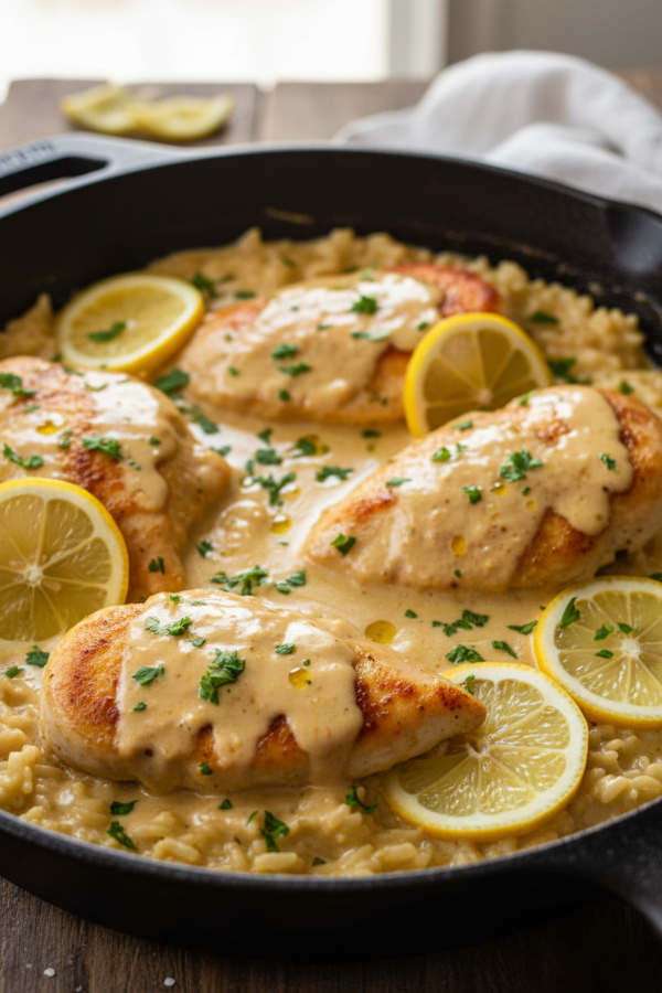 Creamy Lemon Parmesan Chicken And Rice is one of those weeknight dinners that feels like a small win—comforting and creamy, but lifted by lemon so it doesn’t sit heavy, and simple enough that you’re not stuck in the kitchen all night. If you follow the rhythm (brown the chicken, let the rice steam, then finish gently with Parmesan and lemon), it comes out reliably good, and the leftovers reheat like a dream with a quick splash of broth. Make it as-is when you want easy comfort, or toss in spinach or mushrooms when you want it to feel a little “healthier” without changing the whole plan—either way, it’s the kind of recipe you’ll come back to because it fits real life.