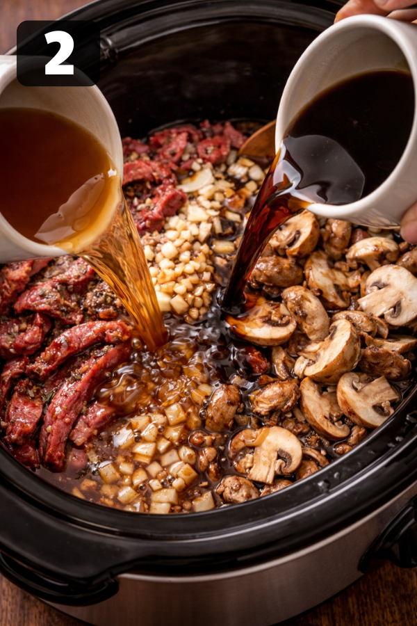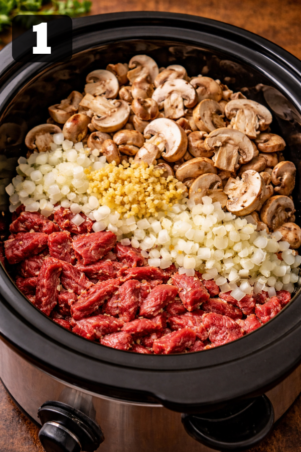 - Step 1: Load It UpAdd the beef, onions, garlic, and mushrooms into your slow cooker.No need to overthink it—just layer everything in.