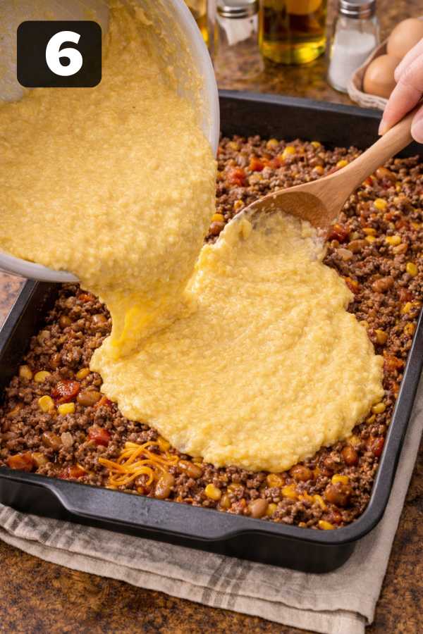 - Assemble the Casserole Spread the beef mixture evenly in your baking dish. Then gently pour the cornbread batter over the top. Try to cover the filling as evenly as possible. Don’t stir the layers together—the separation is part of what makes the dish work.