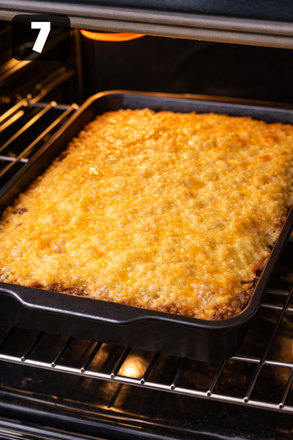 - Add Cheese Sprinkle shredded cheese over the beef mixture. You can stir it in or leave it layered. Either works. The cheese melts during baking and creates that creamy texture people love.