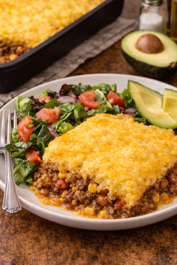 You brown some beef, stir in a few canned ingredients, top it with cornbread batter, and bake. That’s the whole idea. No complicated techniques. No long prep list. Just simple cooking that works.