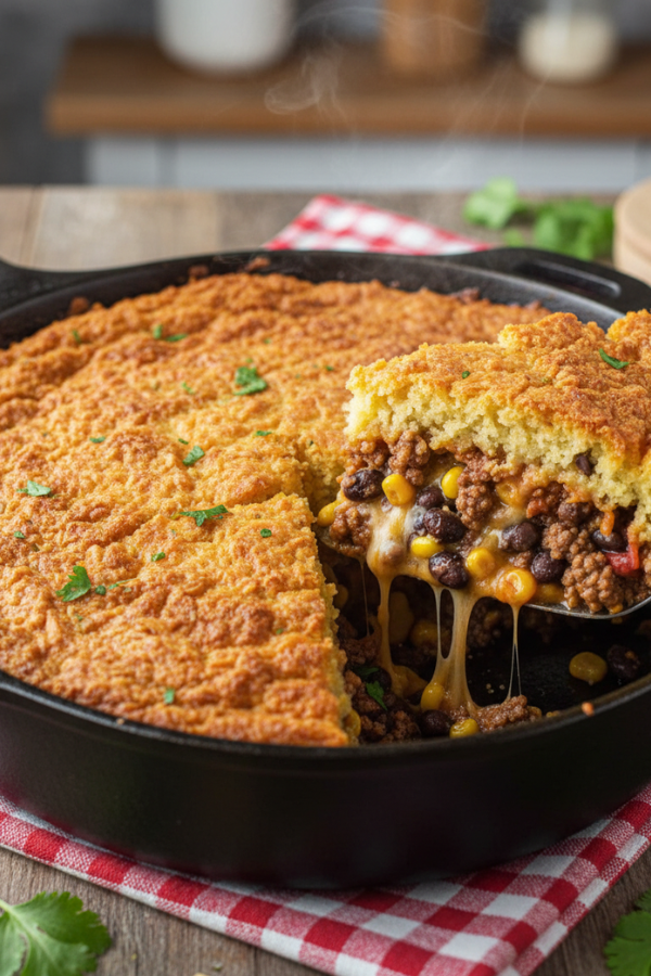 Cornbread batter spreads over the beef mixture and bakes into a golden crust. The edges become slightly crisp while the center stays soft and fluffy.