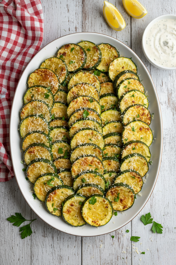 - Serve It Hot And Happy Once it’s done: Let the zucchini rest on the pan for 2–3 minutes so the cheese sets. Use a spatula to lift the slices, scraping up any extra crispy cheese from the pan. Those “cheese chips” are gold. Finish with: A sprinkle of fresh parsley or basil, if you have it. A squeeze of lemon adds brightness if the dish tastes rich. Serve right away with your favorite dip—ranch, marinara, garlic yogurt, even a spicy mayo. It disappears faster than you’d expect, especially if you eat one straight from the pan “just to test it.”