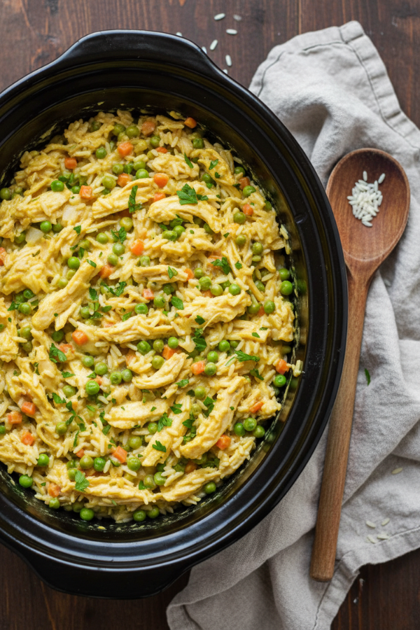 - Step 5: Shred the Chicken and Stir Everything Together Once cooked, remove the chicken to a plate and gently shred it with two forks. Return the shredded chicken to the crock pot and stir well to mix with the rice and veggies. If the mixture looks a bit dry, add a splash of broth or milk to loosen it.