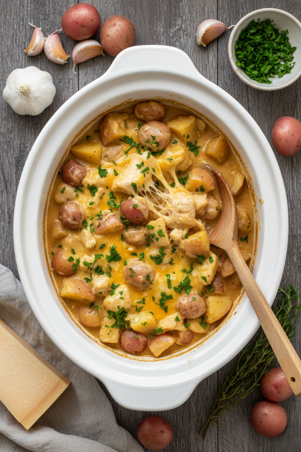 - Step 7 – Taste, Garnish, and Serve When the cheese is melted and the potatoes are tender, turn off the slow cooker. Give the sauce a gentle stir near the edges and taste a spoonful. Adjust with a pinch of salt, pepper, or extra Parmesan if needed. Spoon into bowls or plates, making sure everyone gets chicken, potatoes, sauce, and veggies. Finish with fresh parsley on top. Is it fancy? Not really. Is it satisfying on a cold night when you’re tired and hungry? Absolutely.