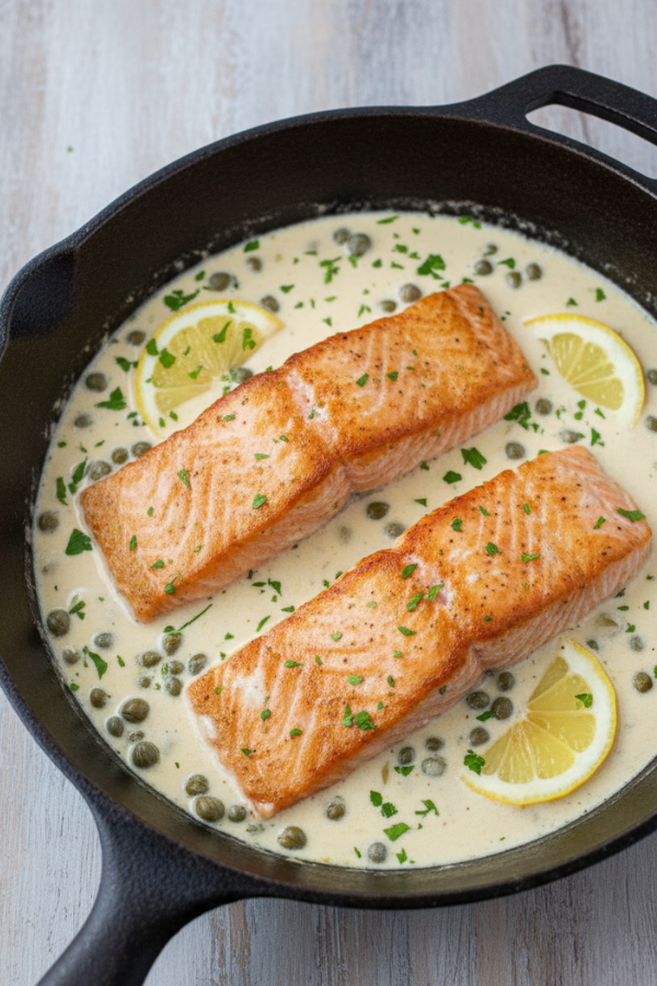 This is one of those dinners that makes you feel like you’ve got your life together—even if you absolutely don’t. Bright lemon, briny capers, tender salmon, and a creamy sauce that makes everything on the plate taste better. Try it once, then make it yours: more lemon, fewer capers, extra parsley… whatever fits your kitchen mood.