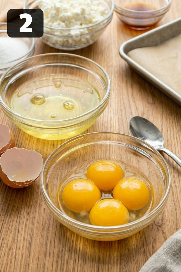 Next, carefully separate the egg whites and yolks into two bowls. Even a small amount of yolk can affect how well the whites whip, so take your time.