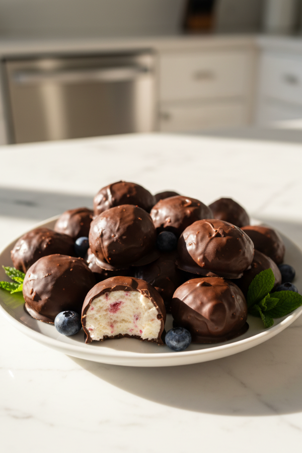 - Freeze Until Firm Slide the tray into the freezer. Wait about 2–3 hours. When ready, the bites should feel firm and hold their shape when lifted. This step matters. If they’re too soft, dipping them in chocolate becomes messy.