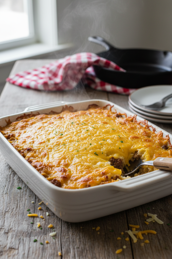 Ground beef brings rich flavor. Frozen hash browns soak up the creamy sauce. Cheddar melts across the top and turns golden in the oven. The result? A casserole that tastes like something grandma might have made on a Sunday—but it’s ready on a Tuesday night.