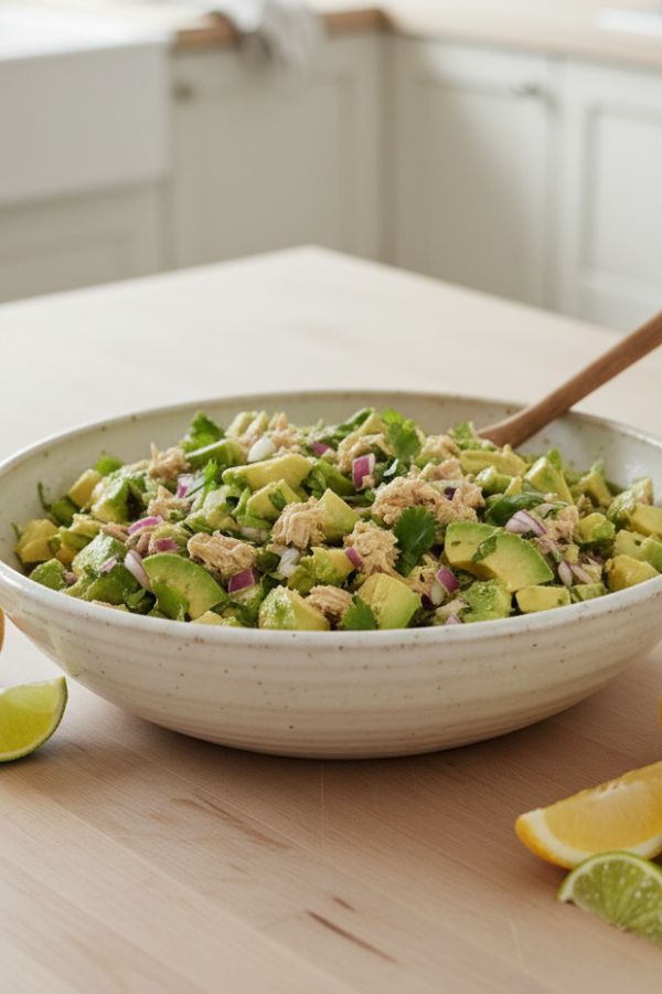 It keeps the classic tuna-salad comfort, just lighter and cleaner: avocado makes it rich, citrus wakes it up, and celery plus onion add that crunchy bite that makes every forkful feel satisfying. Keep it basic, or toss in jalapeño and herbs for a little “okay, this is actually amazing” moment—especially on those afternoons when you need real food, not a chips-and-dip detour.