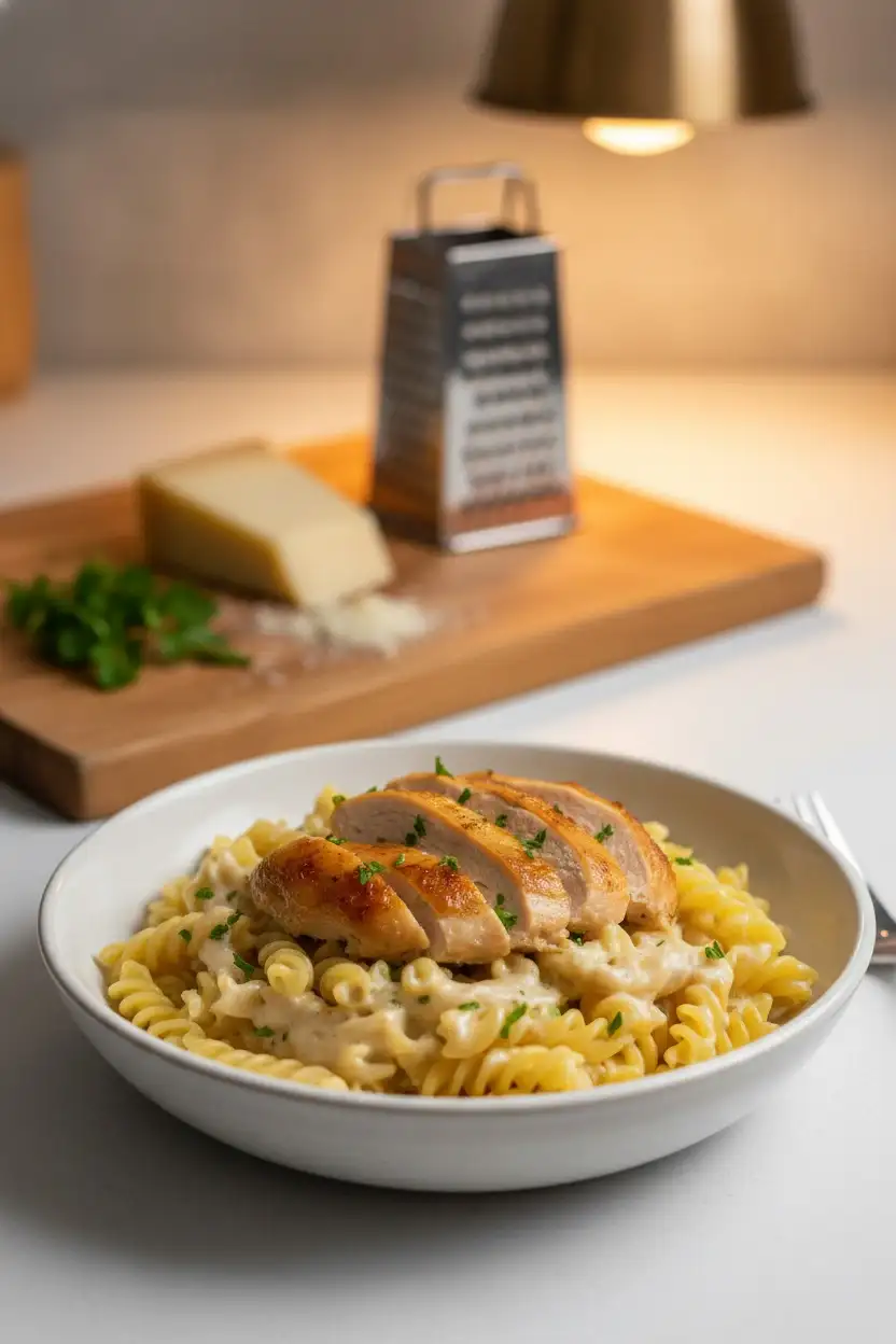 It’s lighter than the classic cream-based versions because we use broth + milk + yogurt instead of only heavy cream, plus lean chicken and the option for whole-wheat pasta. - Can I use rotisserie chicken?