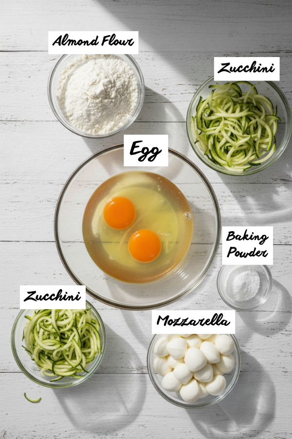 In a bowl, combine almond flour and baking powder. Add the egg and cheese, then fold in the zucchini.