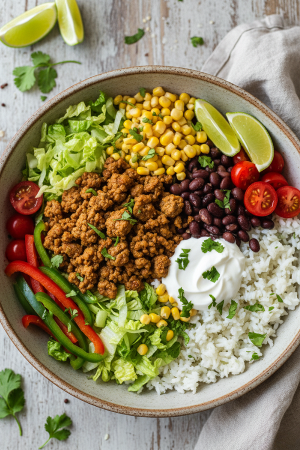 - Step 7 – Assemble your High-Protein Ground Beef Taco Bowl For each bowl: Add a scoop of rice or roasted sweet potato as your base. Add a handful of shredded lettuce on one side. Spoon on a generous amount of the beef–bean–corn mixture. Add a layer of sautéed peppers. Top with cherry tomatoes, avocado, and cilantro. Add a big dollop or drizzle of Greek yogurt sauce on top. Finish with a squeeze of fresh lime. If you want it extra fun (and the kids will love this), sprinkle on a few crushed tortilla chips for crunch. And yes, if you accidentally pile the bowl too high, you’re doing it right.
