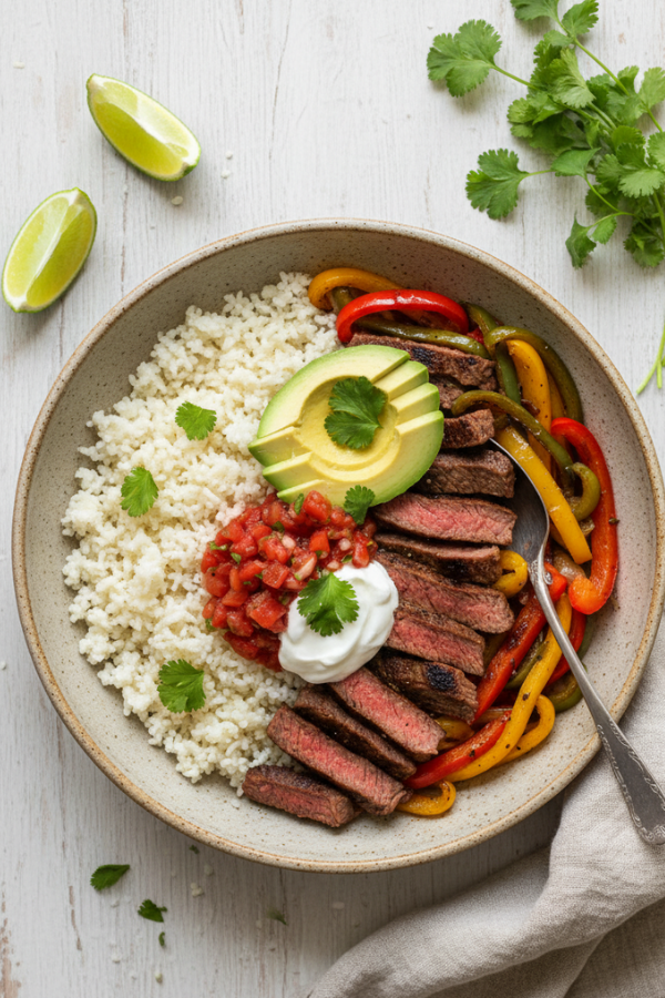 - Slice The Steak And Assemble Bowls Now the fun part. Slice the rested steak thinly against the grain. This single step is one of the big tenderness secrets. Fill each bowl with: 1–1½ cups cauliflower rice (or salad greens) A generous handful of peppers and onions 4–5 oz sliced steak Top with: A spoonful of Greek yogurt or sour cream Sliced avocado or a scoop of guacamole Salsa, cilantro, jalapeños, lime wedges It looks like something from your favorite burrito chain, only you know exactly what went into it.