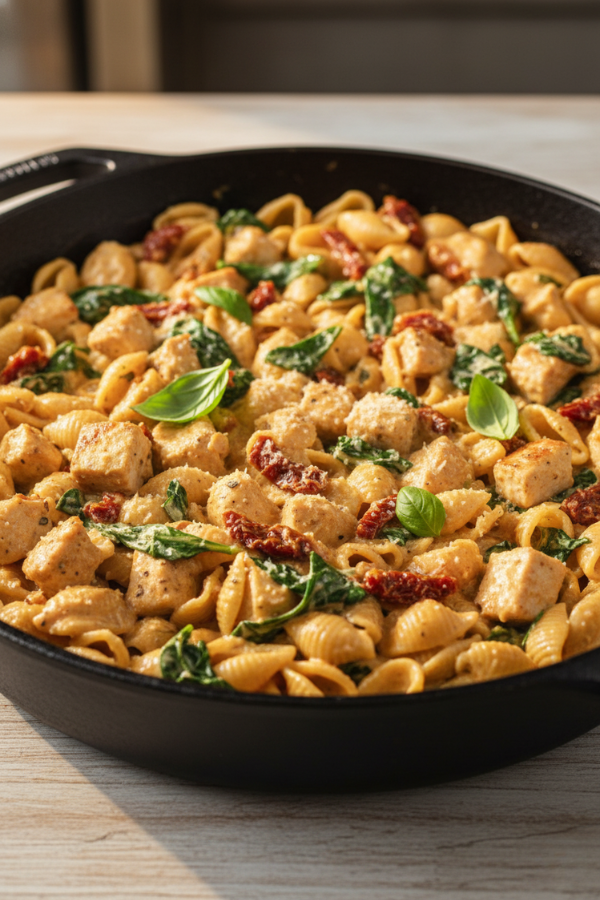 - Step 5 – Bring the chicken and pasta back to the party Add the cooked chicken (and any juices on the plate) to the skillet. Stir to coat it in the sauce. Then add your pasta. Toss everything together so the sauce clings to every shell or twist. If the sauce feels too thick, use splashes of the reserved pasta water or extra broth until it reaches that “luxuriously creamy but still clings to the spoon” stage. Taste and adjust: Needs salt? Add a bit more. Too rich? A tiny squeeze of lemon wakes it up. Want more heat? Sprinkle on extra red pepper flakes.