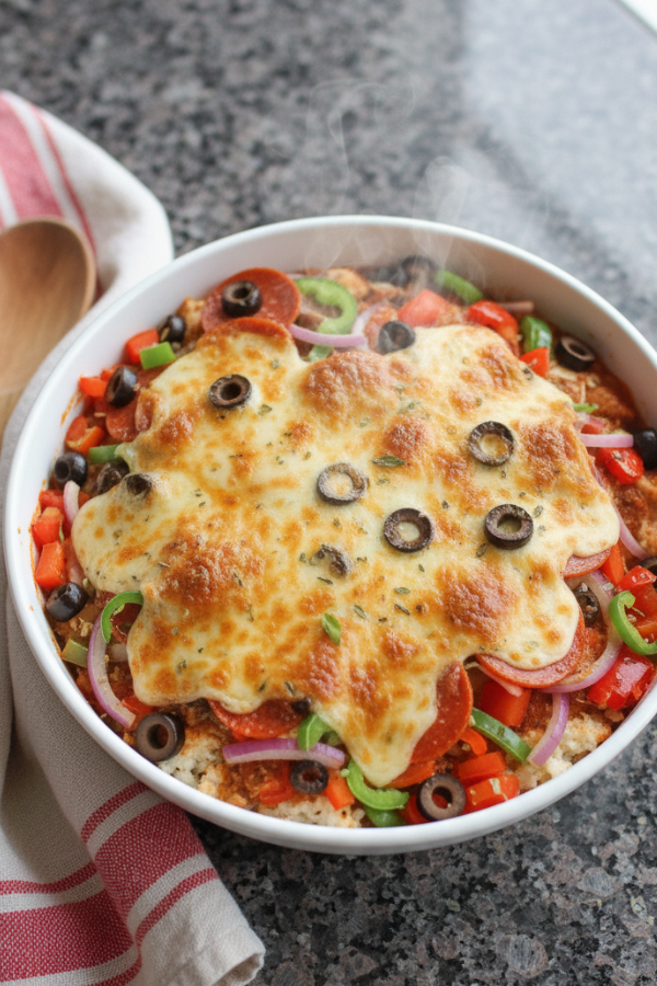 - Step 3: Add Mozzarella (Don’t Skimp) Sprinkle a generous handful of shredded mozzarella over the sauce—enough to fully cover the top. This is the layer that gives you the cheese pull. Don’t worry about using too much; the bowl doesn’t have crust, so the extra cheese adds richness without making the meal heavy.