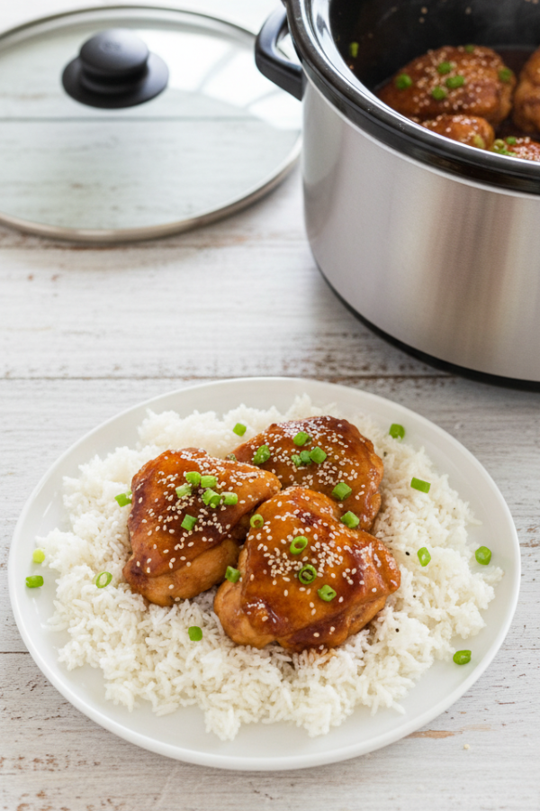 - Thicken the Sauce (This Makes It Restaurant-Like) When the chicken is done: Use tongs to lift the thighs to a plate, or push them gently to one side. In a small bowl, stir 1–2 tablespoons cornstarch with the same amount of cold water. Pour the slurry into the hot cooking liquid, stirring as you go. Turn the slow cooker to HIGH and cook 10–15 minutes, lid on, until the sauce thickens and turns glossy. If you’re in a hurry, you can pour some of the liquid into a small saucepan, whisk in the slurry, simmer till thick, then pour it back over the chicken.