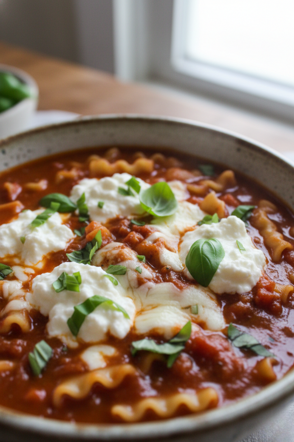 - Build The “Lasagna” Bowl While the soup rests for a minute, make your cheese mixture: In a small bowl, mix the ricotta with a little salt and pepper if you like. Keep the shredded mozzarella and Parmesan nearby. To serve: Ladle the hot soup into bowls. Add a spoonful (or two) of ricotta right in the center. Sprinkle mozzarella and Parmesan over the top. Finish with fresh basil or parsley and maybe a pinch of red pepper flakes. The cheese melts into the hot soup and gives you that stretchy, creamy lasagna experience with every spoonful. It’s pretty magical for a Tuesday night.