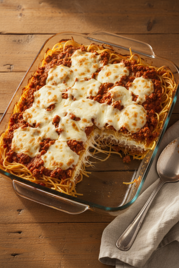 - Layer Like A Lazy Lasagna Preheat your oven to 350°F (175°C) and grease a 9×13 baking dish. Then build your casserole: Bottom layer: spread half of the sauced spaghetti in the dish. Creamy layer: dollop the entire cream cheese mixture over the pasta and spread it gently. It doesn’t have to be perfect—little pockets of cream are nice. Second pasta layer: add the rest of the spaghetti and spread it out. Meat sauce: pour the meat sauce evenly over the top. Cheese topping: sprinkle mozzarella and Parmesan over everything. You’ll see layers of noodles, cream, sauce, and cheese. It should look hearty and a bit extra—that’s the point.