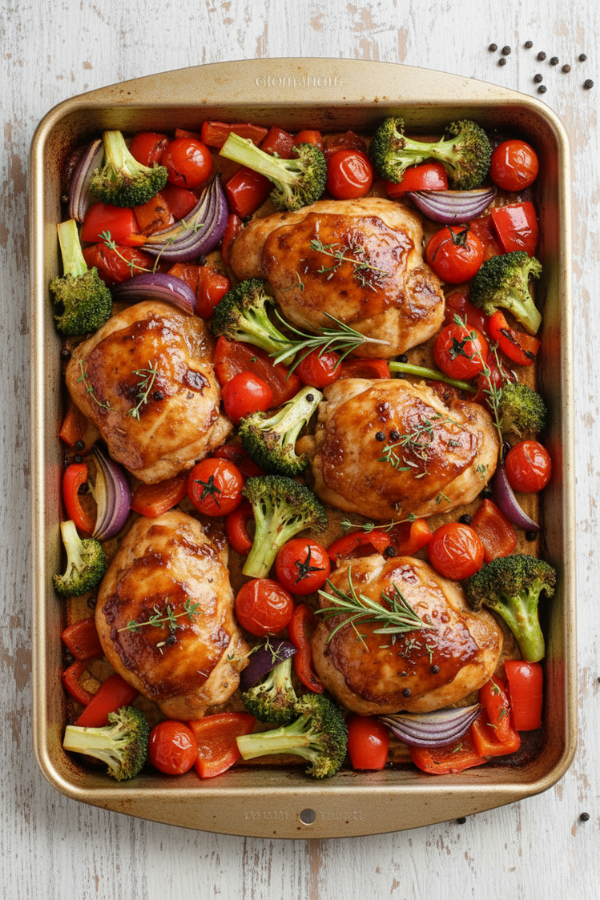 This is the kind of dinner you make when you want something real—tender chicken, roasted veggies, and that sweet-tangy balsamic glaze that tastes like you tried harder than you did. It’s fast, it’s healthy-ish without feeling “diet,” and it all happens on one pan (which means the sink stays calm).