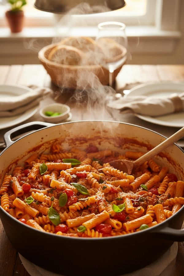There’s something deeply comforting about a pot of pasta simmering away on the stove, especially when you can walk into the kitchen knowing you only need one pot to make it happen. That’s the charm of One-Pot Creamy Tomato Basil Pasta. Everything—pasta, tomatoes, broth, milk—goes in together, and they cook at the same time. No draining. No juggling pans. Just a gentle, steady simmer that brings everything together in one neat, creamy swirl.