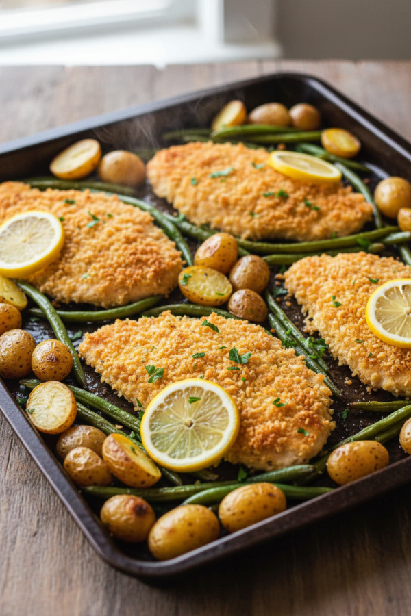 - Rest, Garnish, And Serve Let the chicken rest on the pan for 5 minutes. This helps the juices settle and the crust firm up. Sprinkle chopped parsley over the top. Add lemon wedges to the pan or the plate and a bit more grated Parmesan if you’re feeling generous. That’s it—one pan, full dinner, very few dishes in the sink.