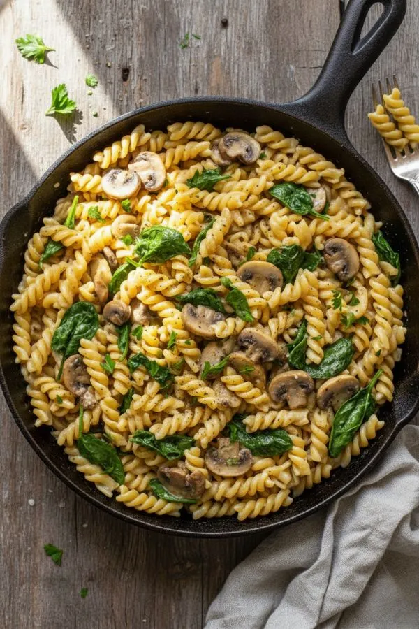 A warm, garlicky skillet of pasta tossed with mushrooms, baby spinach, and a silky Parmesan sauce — this is comfort food simplified. Ready in just 30 minutes, this recipe hits all the right notes: creamy without being heavy, quick without cutting corners, and flavorful enough to make even weeknights feel special.