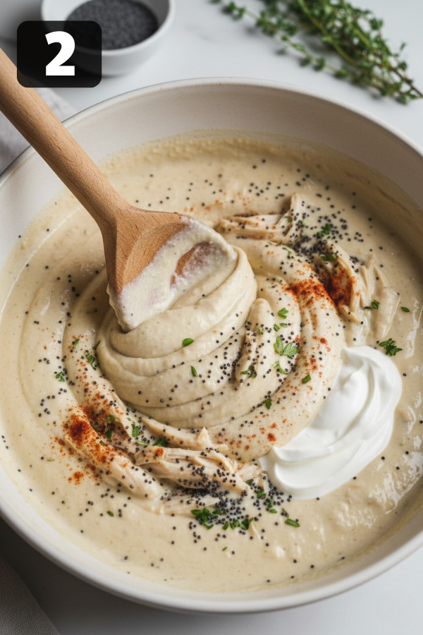 - Step 2 – Make the Creamy FillingIn a large bowl, combine:ChickenCream of chicken soupSour creamPoppy seedsSeasoningStir until evenly mixed.You want it thick and creamy, not watery.