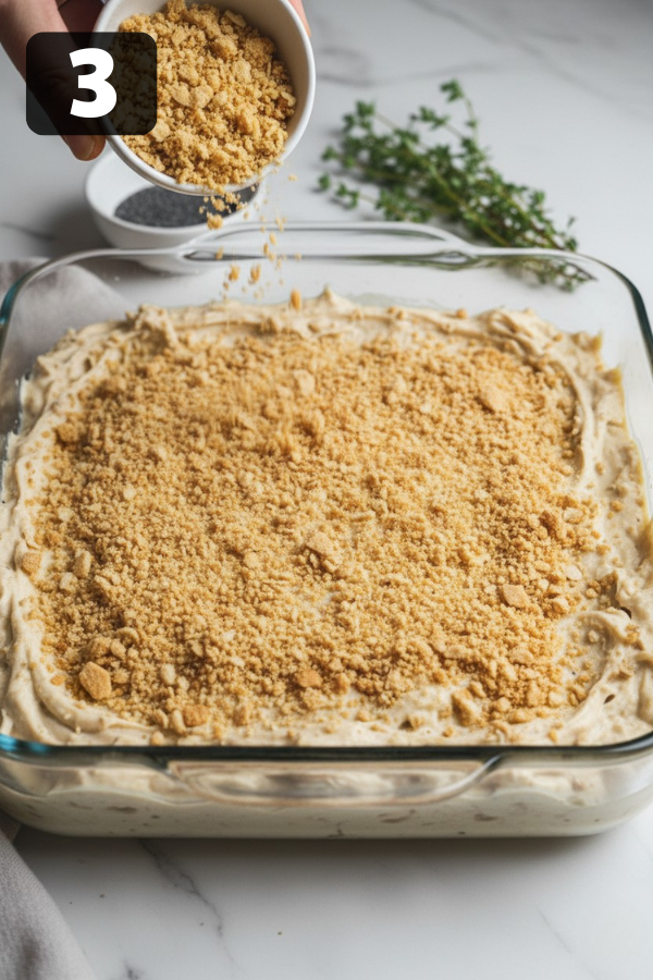 - Step 3 – Assemble the CasseroleSpread the mixture evenly into your baking dishIn another bowl:Mix crushed crackers + melted butterSprinkle over the topDon’t press it down.Loose topping = better crunch.