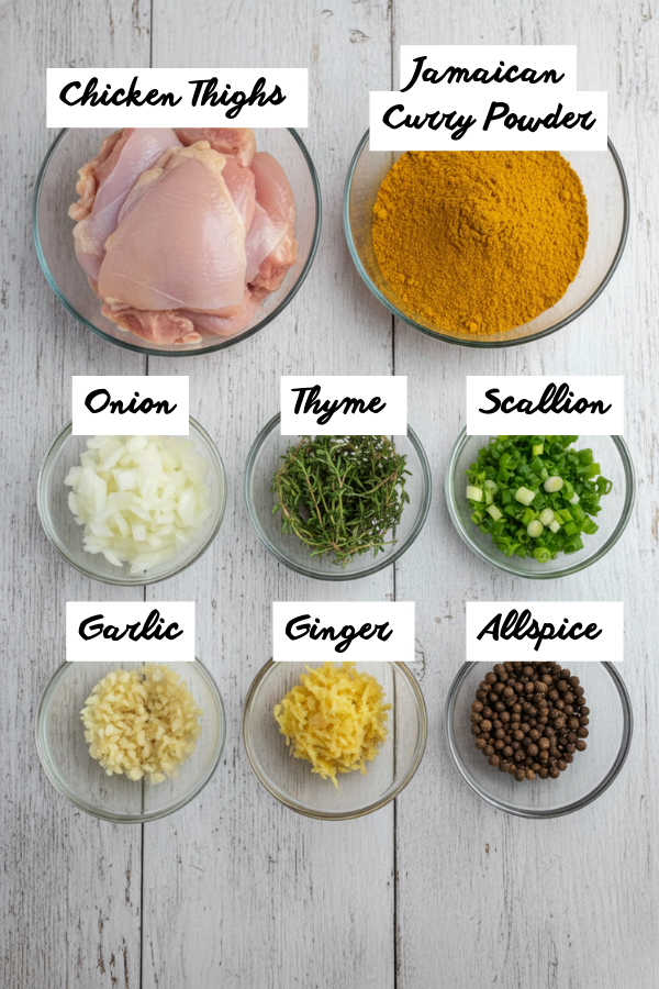 - Chicken thighs Jamaican curry powder, onion, scallion, garlic, ginger, thyme, allspice
