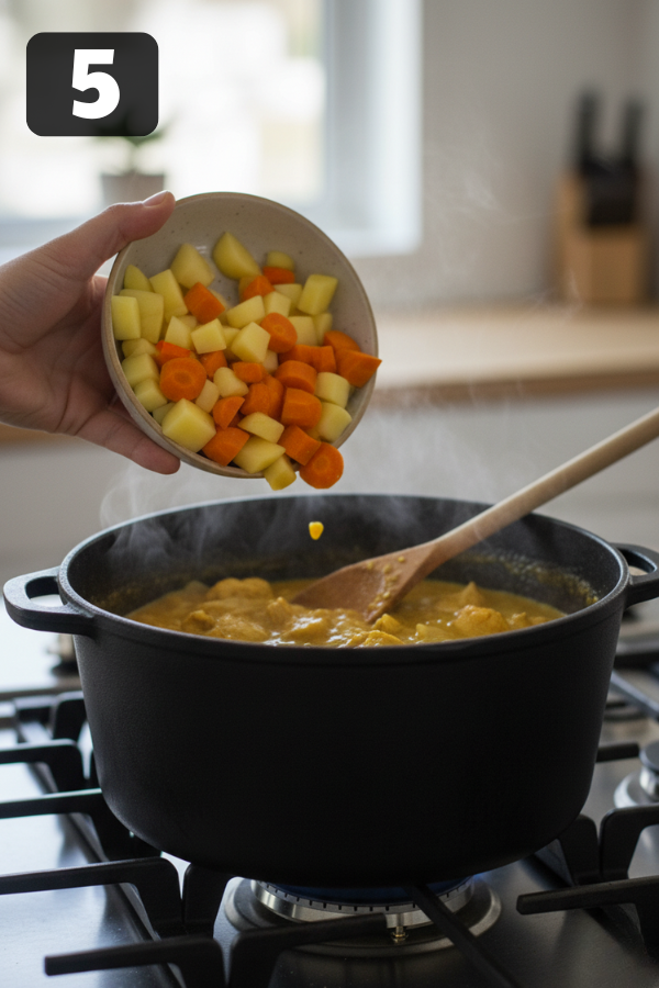 - Step 5: Add Potatoes Near The End (About 15 Minutes Left) Stir in chopped potatoes (and carrots if using). Cover again and cook until potatoes are tender, about 15 minutes. Potatoes thicken the sauce as they cook. That’s part of why this curry feels so comforting.