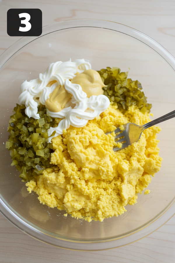 - Make The Filling (Creamy, Not Runny) Pop the yolks into a mixing bowl. Add mayonnaise, relish, mustard, salt, and pepper. Mash with a fork until smooth and fluffy. Texture goal: spoonable and thick enough to hold its shape. If it’s too stiff, add a tiny spoonful of mayo or a few drops of pickle juice. If it’s too loose, chill it for 10–15 minutes before filling. Honestly, the difference between “fine” and “wow” is often just mashing long enough. You want the filling to feel like a smooth spread, not crumbles.