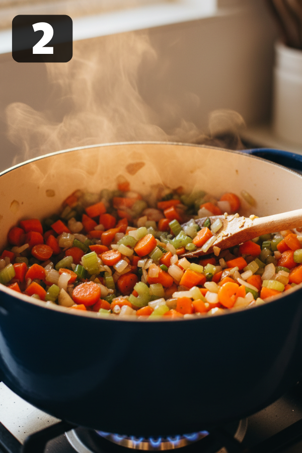 - Build the Base In a large Dutch oven or heavy pot, sauté onion, carrots, and celery in a tablespoon of olive oil over medium heat until softened (about 5–7 minutes). Don’t rush this part. Soft vegetables build flavor.