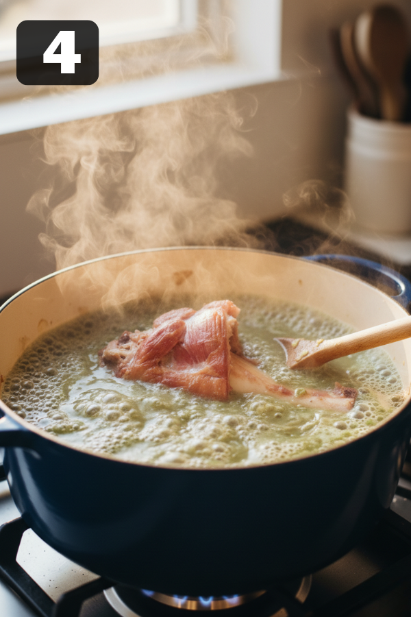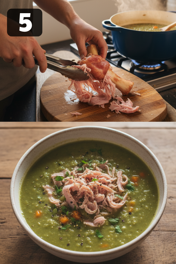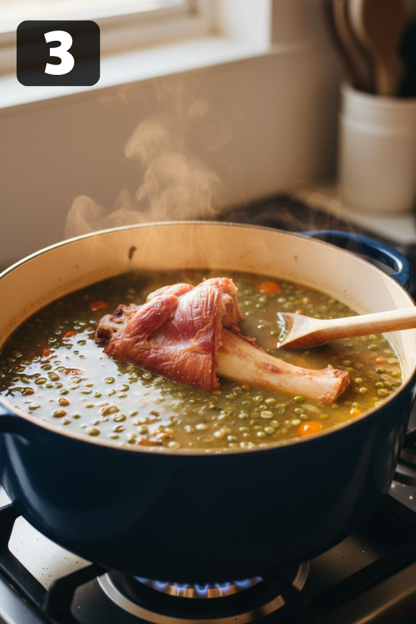 - Finish It Remove hambone and bay leaves. Shred any meat from the bone and return it to the pot. Taste before adding salt—the ham already brings plenty. That’s it. You’ll notice the texture shifts slowly from brothy to creamy. That transformation? That’s the peas breaking down.