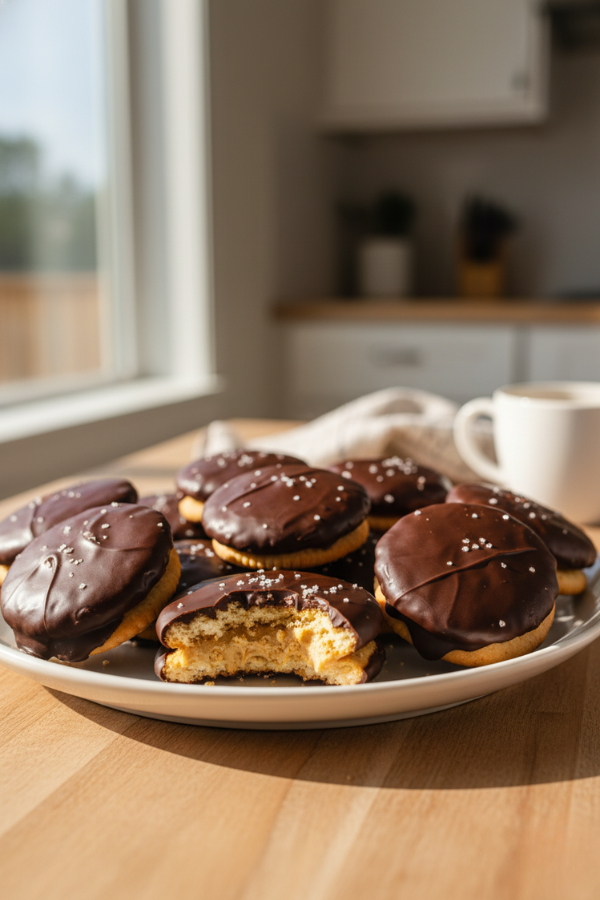 - Chill the Sandwiches Place the tray in the refrigerator for 20–30 minutes. This step firms up the peanut butter so the cookies hold together when dipped in chocolate. It might feel like an unnecessary pause, but trust me—it makes the next step easier.