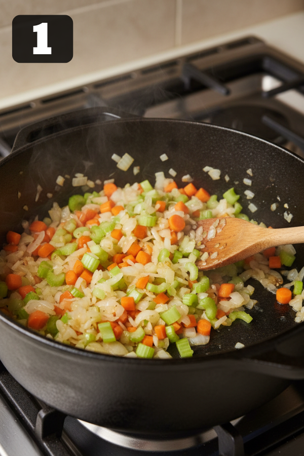 1. Sauté onion, carrots, and celery in butter and oil (6–8 minutes). Add garlic; cook 30 seconds.