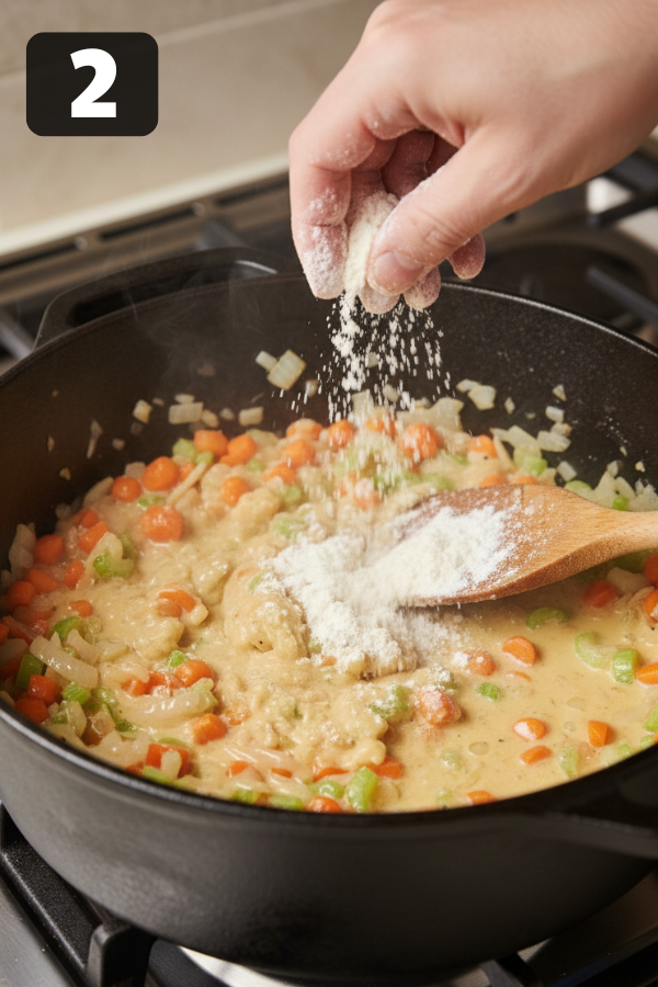 Sprinkle the flour evenly over the vegetables. Stir constantly for 1 minute. This cooks out the raw flour taste.